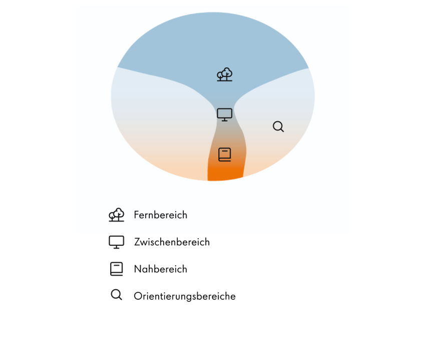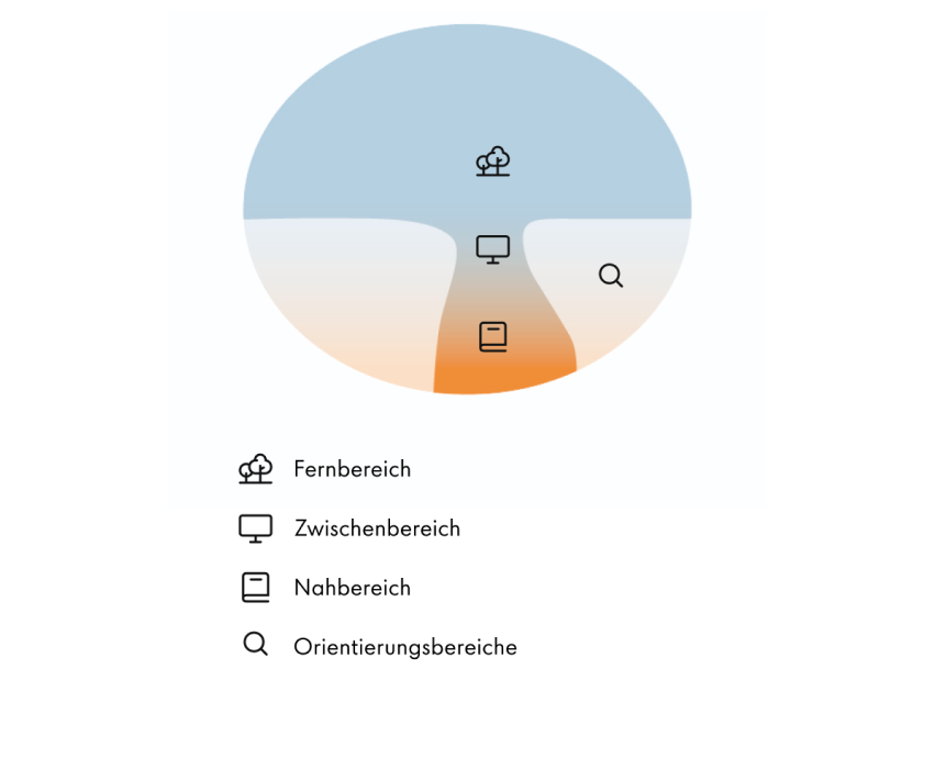 Standardgläser - die solide Basis für klare Sicht Ein Gleitsichtglas ist von oben nach unten in verschiedene Sehbereiche aufgeteilt: oben die Ferne, in der Mitte der Zwischenbereich für mittlere Distanzen und unten die Nähe für Details und Kleingedrucktes. Seitlich liegen die Randbereiche, die technisch bedingt etwas unschärfer wirken.